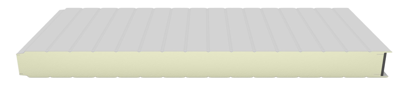 Panel para cielos y muros de cámaras frigoríficas tipo sándwich, inyectado en línea continua con poliuretano expandido de alta densidad empacada (40 + 2 kgs/m³ empacada) y con ambas caras con lámina de acero galvanizada prepintada.