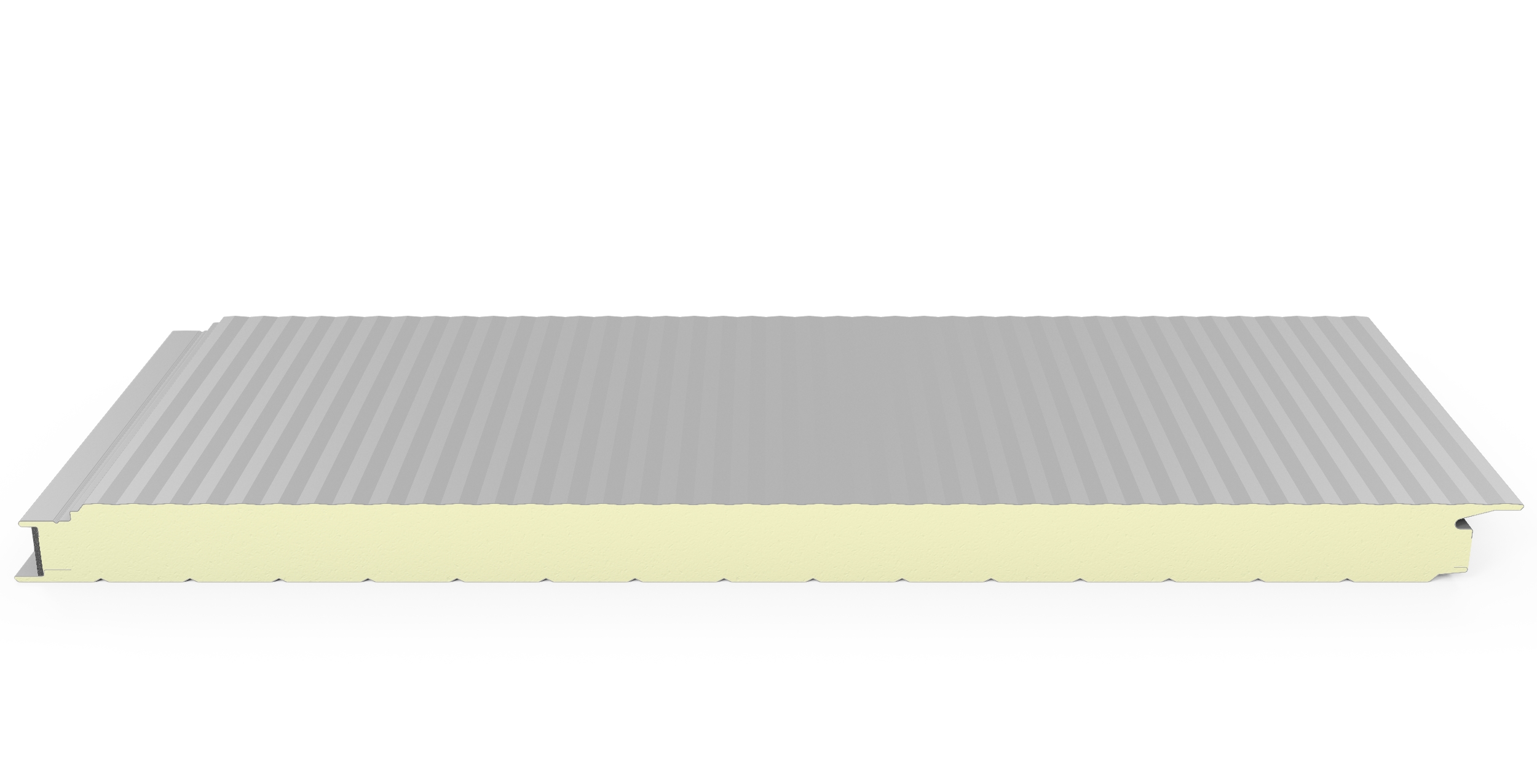 Panel metálico para muros tipo sándwich, inyectado en línea continua con Poliuretano (PUR) o Poli-isocianurato (PIR) expandido de alta densidad (38kg/m3), cara externa y cara interna en lámina de acero galvanizado pre pintado, aluminio y/o Aluzinc.